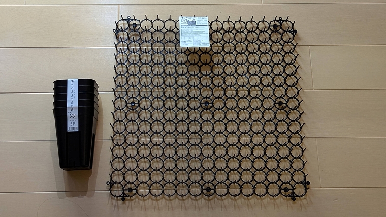いつもの百均アイテムです。「どんとキャット」という猫よけマットと、「プリステラ深型90」です。