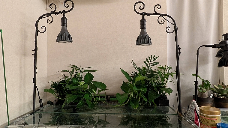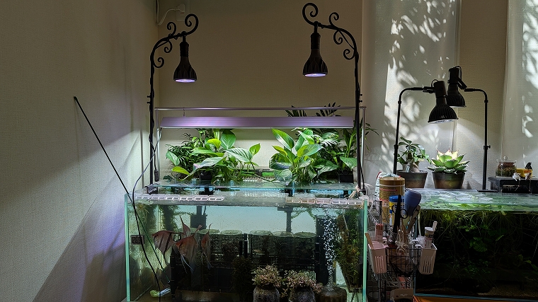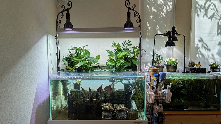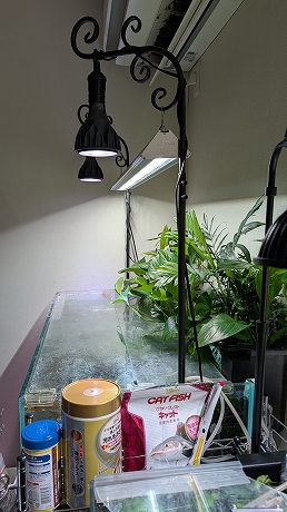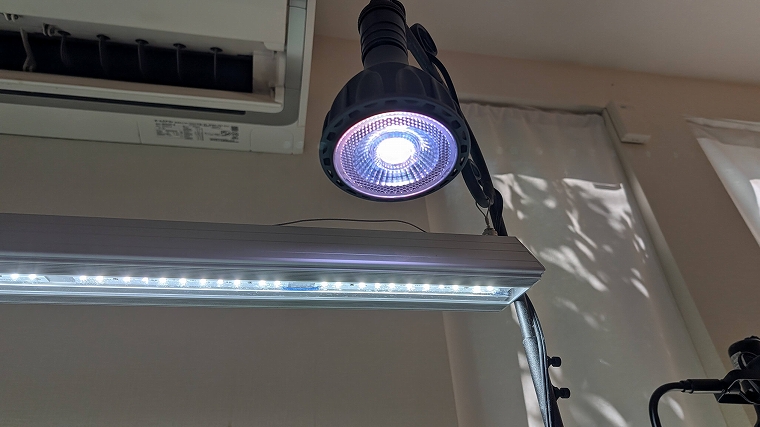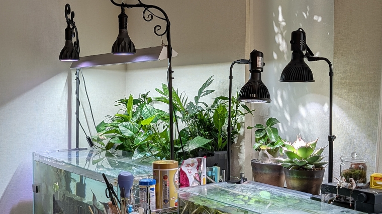 以前の記事で紹介した通り、外掛式フィルターで観葉植物を育てており、そちらにライトを向けるとどうしても水槽手前が暗くなってしまうという問題を抱えていました。