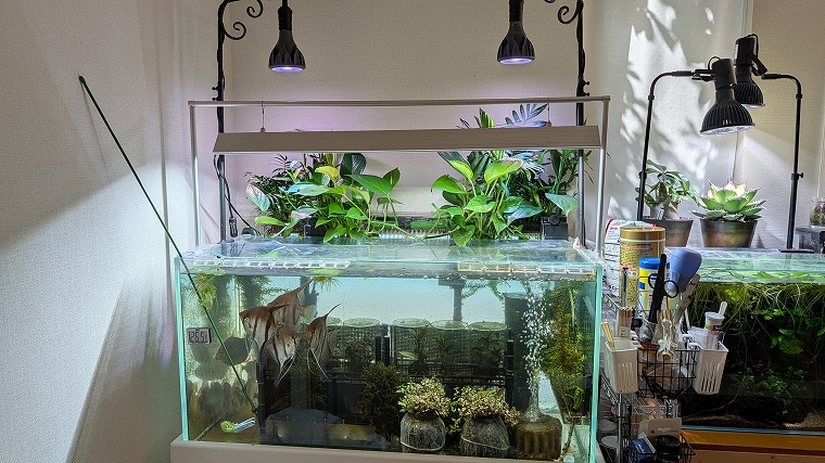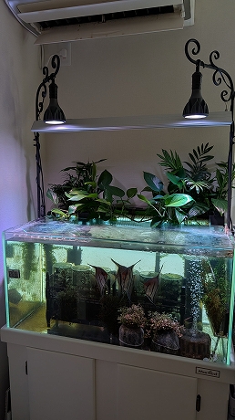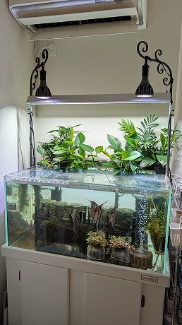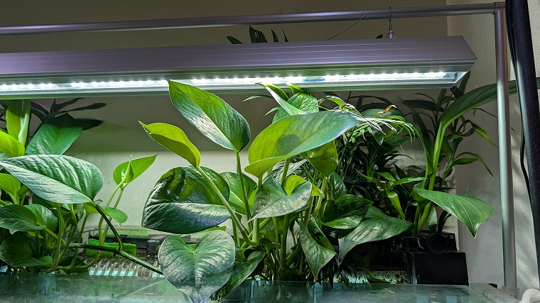 これによって、水槽全体+背面の外掛けフィルター内の観葉植物までしっかり育つ環境が完成しました。