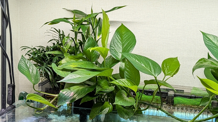 外掛式フィルターに植えた観葉植物にもしっかりライトが届いていますので、植物ろ過にも期待できます。