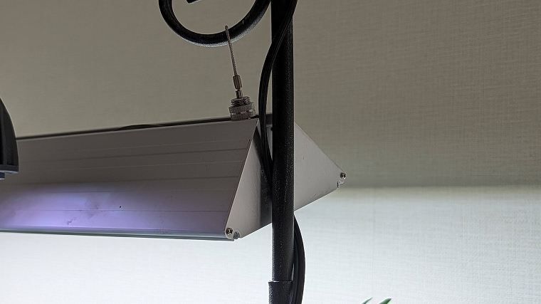最初の案はこのような感じで、アクロの「吊り下げ用ライトスタンドセット」を併用してみるというものでした。しかし、この構成だと上の画像のように目立ってしまいます。
