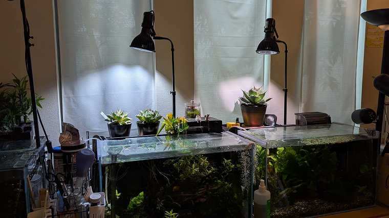 ただ、こうしてしまうと水槽の方に照明が届かなくなるので、もう一本レディオアーム追加の必要がありそうですw