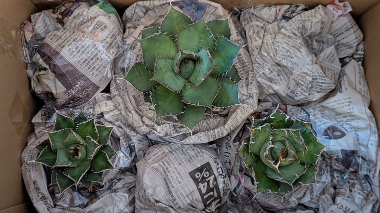 今回、設置するアガベ達です。利用したショップは「四国ガーデン」ですが、いつも通りの丁寧な梱包です。