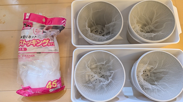 先程用意した植木鉢の上に、水切りネット(ストッキングタイプ)を被せれば完成です。