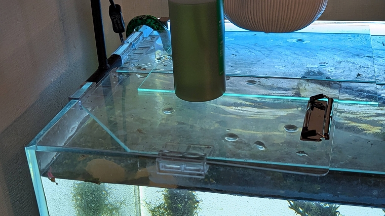 メチニスはビックリすると飛び跳ねて水槽から脱走してしまうことが良くあるので、できるだけ水槽の隙間は埋めたほうが良いです。