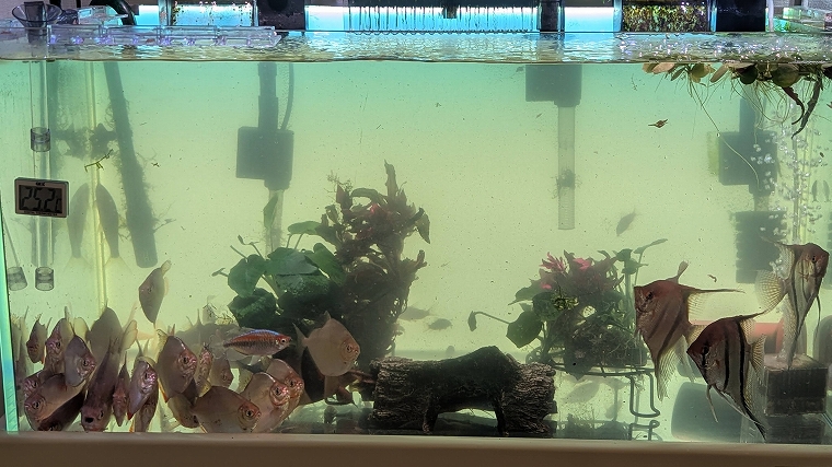 現状、こんな感じです。流木のせいで、水槽内が狭くなっております。