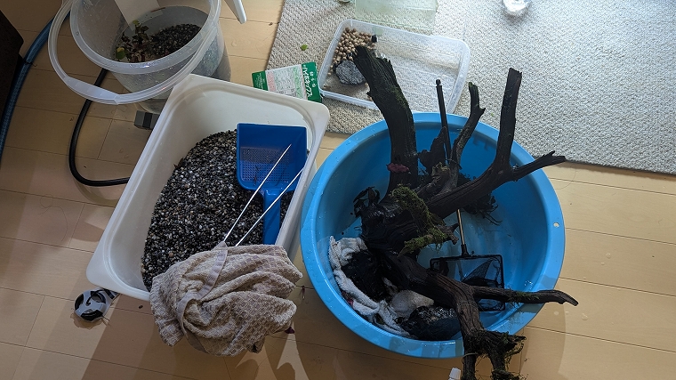 特に大きな流木が入っていることで、底床材の掃除ができない場所がどうしても出てきてしまうため、ここは生体優先、水質優先ということで思い切ってベアタンク化することにしました。