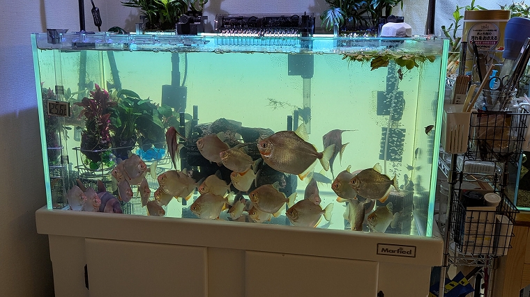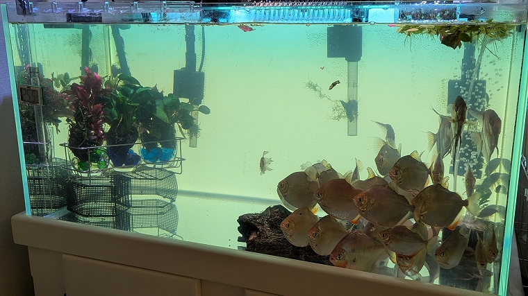 90cm水槽に対するサイズ感としては、このようになります。左のシェルターは人気がないので、ダイソーラックをもう一個作ろうか悩み中です。