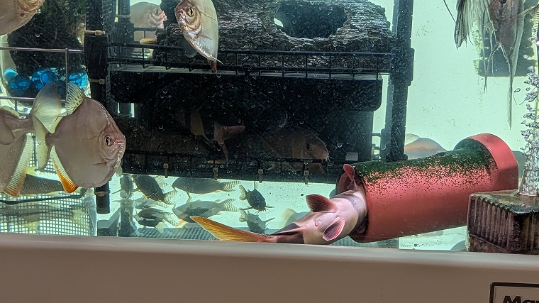 で、水槽にINです。あいにく、めっちゃ警戒されてます(´・ω:;.:…