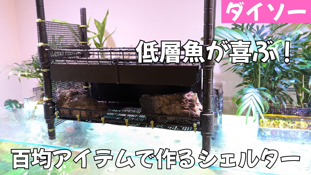 90cm水槽に対するサイズ感としては、このようになります。左のシェルターは人気がないので、ダイソーラックをもう一個作ろうか悩み中です。